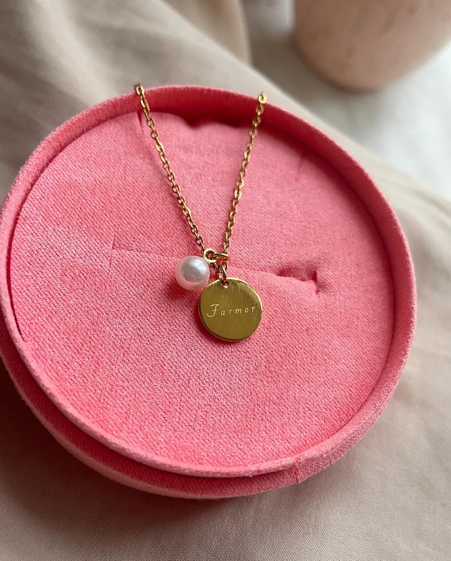 Sød halskæde med rundt vedhæng med indgraveret FARMOR og lille ferskvandsperle.
