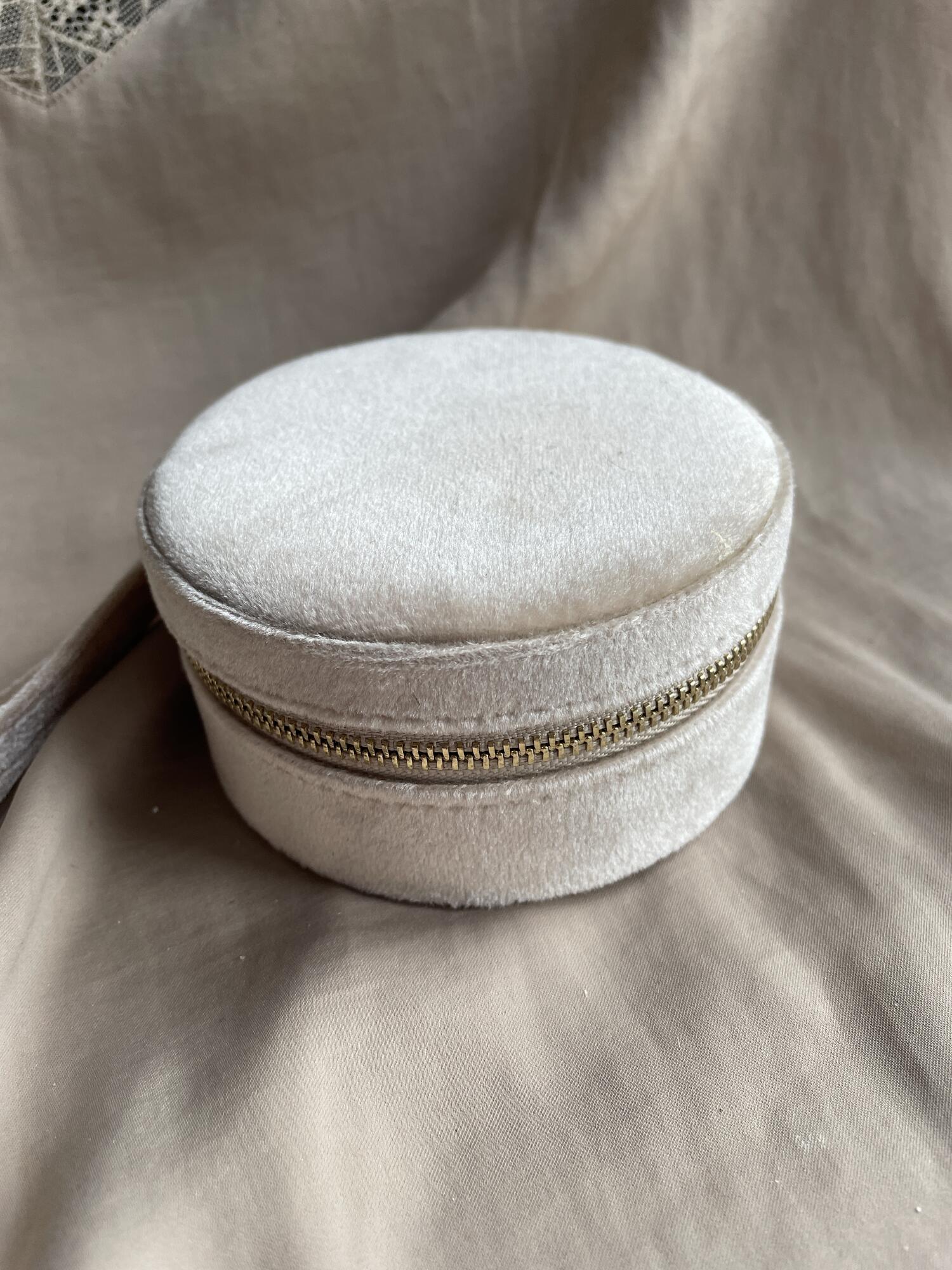 Smuk rundt velour smykkeskrin der er perfekt til at tage med i tasken eller på rejsen.