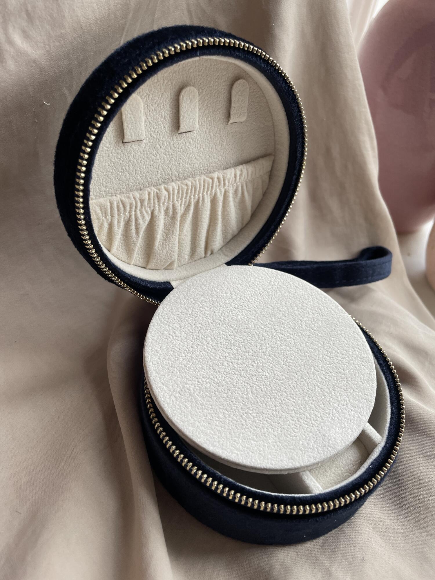 Smuk rundt velour smykkeskrin med spejl. Perfekt til at tage med i tasken eller på rejsen.